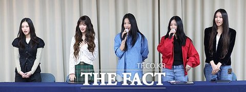 뉴진스(민지 하니 다니엘 해린 혜인)가 28일 저녁 8시 30분 서울 강남구 모처에서 긴급 기자회견을 개최했다. 현장에는 뉴진스 다섯 멤버가 모두 참석했다.
