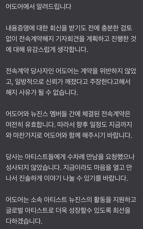 뭐가 소름돋음? 뉴진스가 주장하는 중대한 계약 위반이 입증된 것도 아니고 전속계약 해지됐다고 판결난 것도 아닌데 일방적으로 계약 해지가 가능할거라도 생각함? 그게 가능하면 뉴진스보다 훨씬 더 심각한 상황에 있었던 다른 아티스트들은 bs이라서 소송하고 이름 포기하고 심한 경우는 활동 제약까지 당했겠냐? 상식적으로 좀 생각해봐.. 뉴진스 말대로 되면 소속사에 불만 갖고 있는 다른 아티스트들도 다 전속계약 해지하고 나간다 하겠지ㅋㅋ