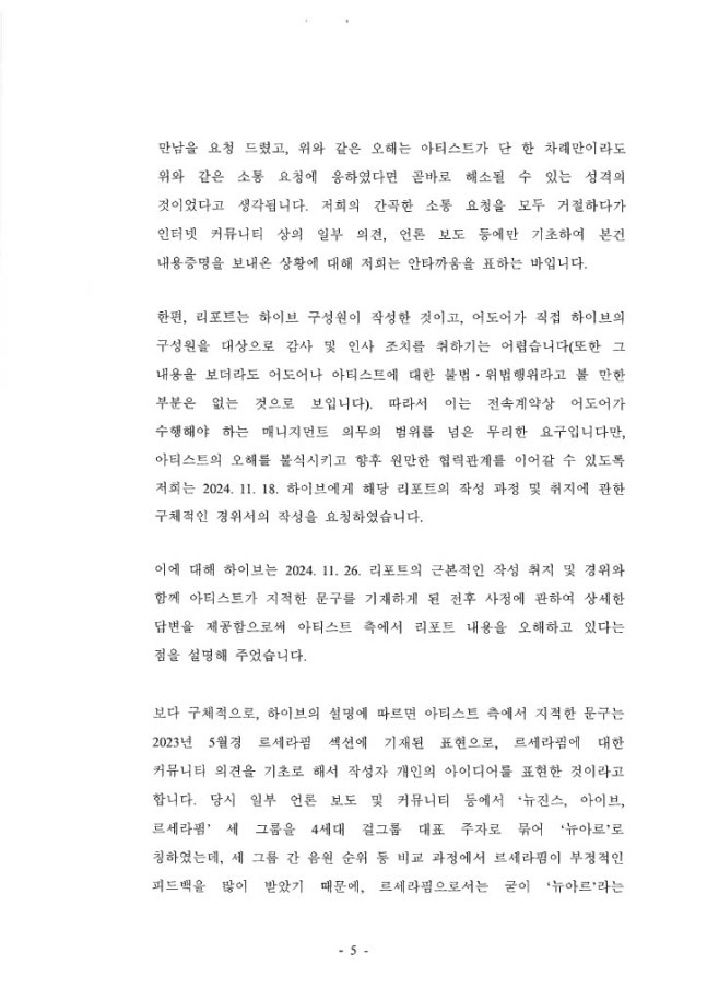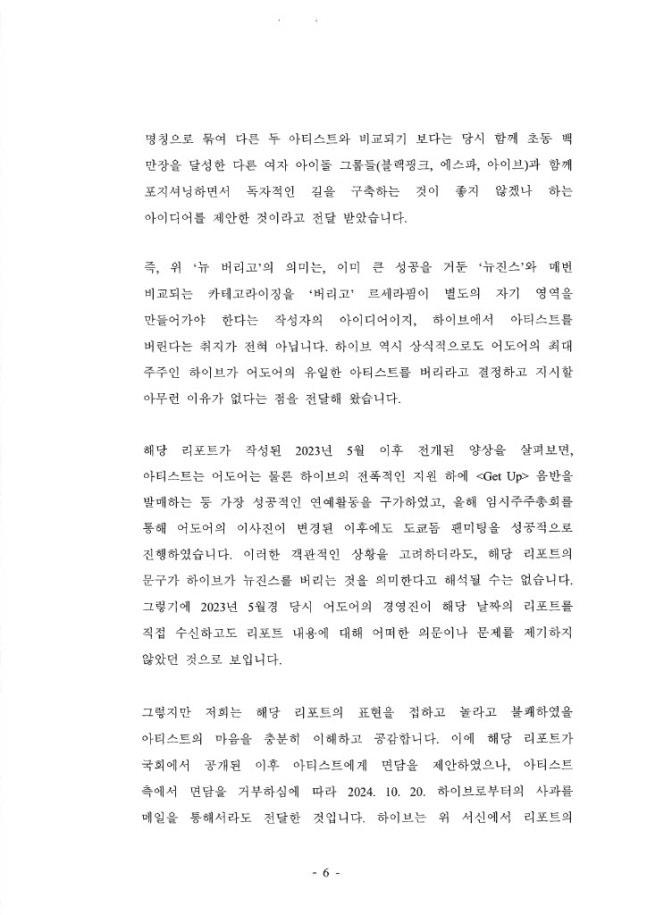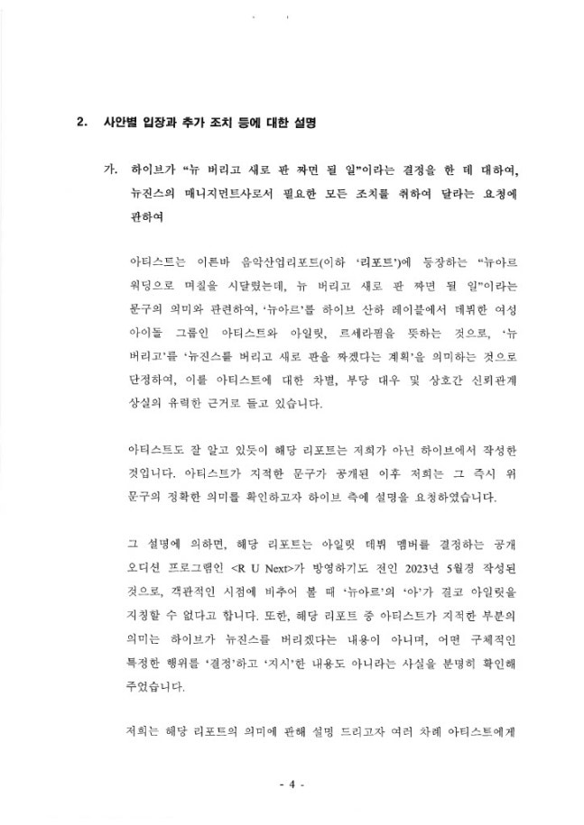 이어 "해당 리포트는 저희가 아닌 하이브에서 작성한 것이다. 아티스트가 지적한 문구가 공개된 이후 저희는 그 즉시 위 문구의 정확한 의미를 확인하고자 하이브 측에 설명을 요청했다"라며 "그 설명에 의하면, 해당 리포트는 아일릿 데뷔 멤버를 결정하는 공개 오디션 프로그램인 'R U Next'가 방영하기도 전인 2023년 5월경 작성된 것으로, 객관적인 시점에 비추어 볼 때 '뉴아르'의 '아'가 결코 아일릿을 지칭할 수 없다고 한다. 또 해당 리포트 중 아티스트가 지적한 부분의 의미는 하이브가 뉴진스를 버리겠다는 내용이 아니다"라고 했다.