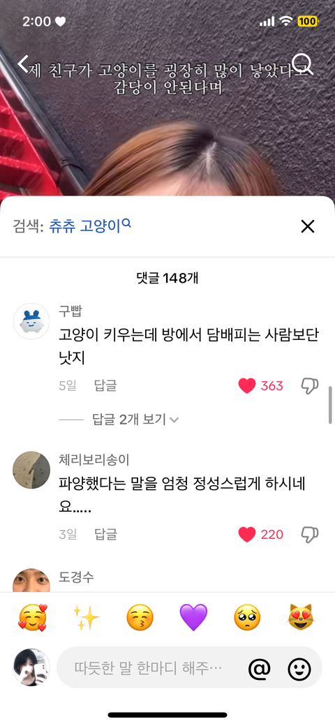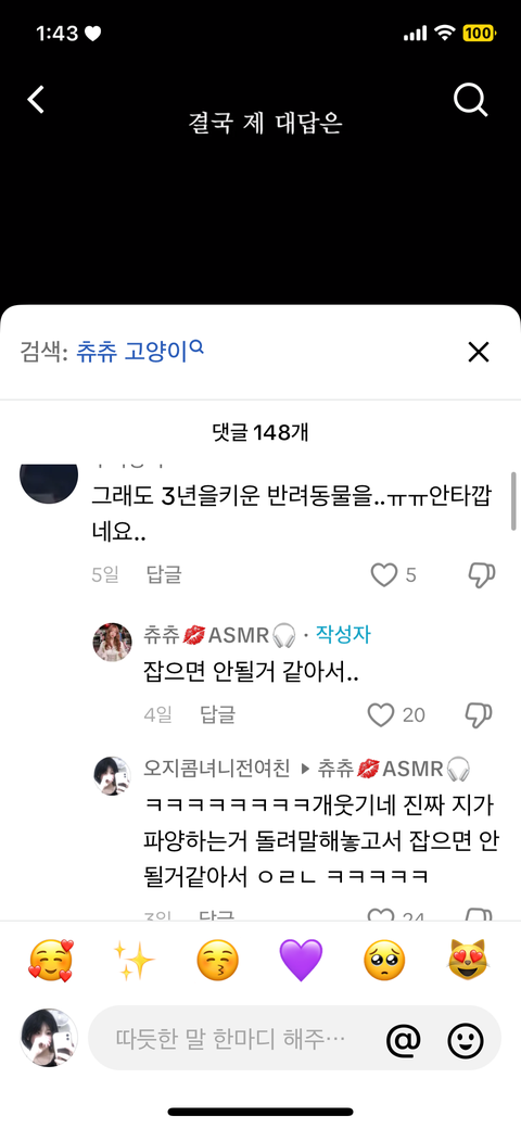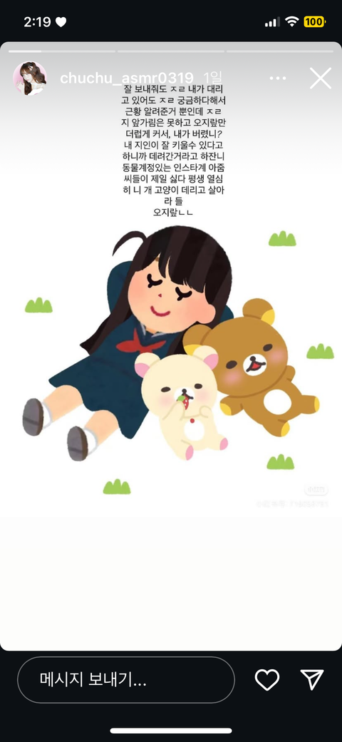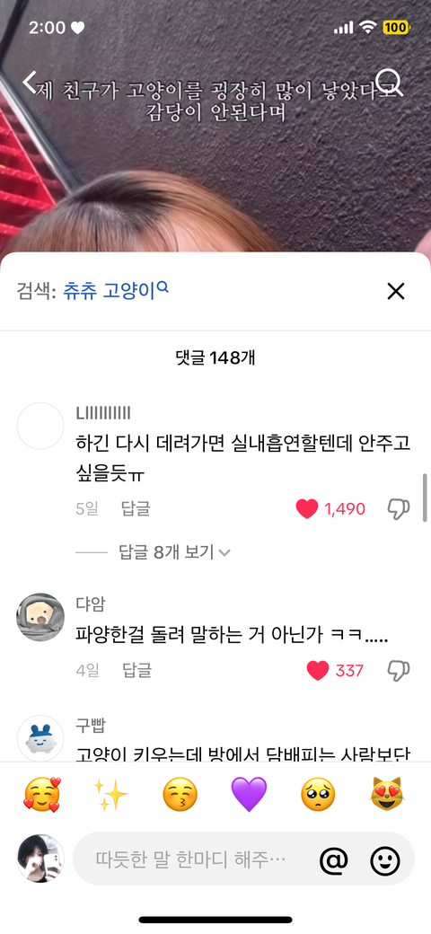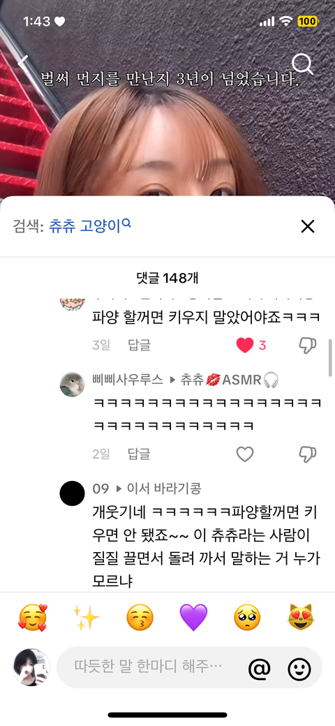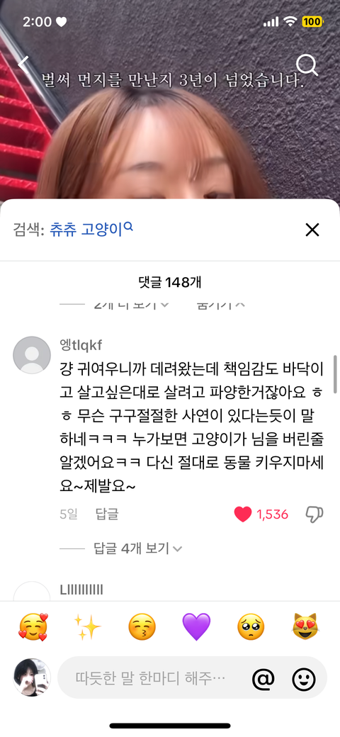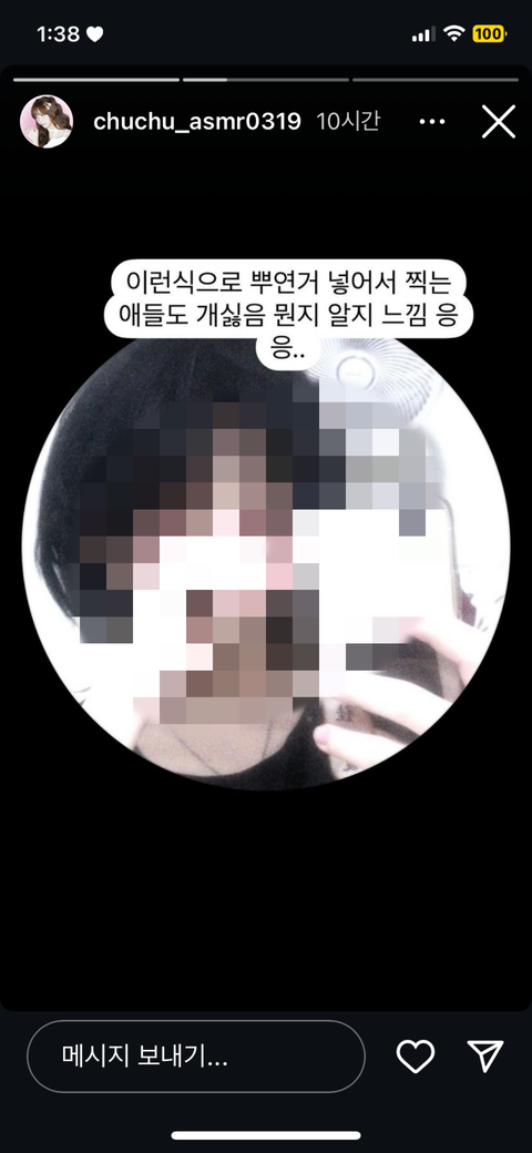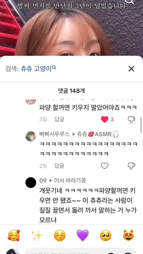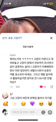 안녕 나는 10대 여학생이야 다들 쿠킹미제라고 한번쯤 들어봤지??지금은 쿠킹미제가 아닌 츄츄asmr이라는 이름으로 유트브,틱톡,인스타,야동사이트에서 활발하게 활동하고있는 크리에이터야 최근에 츄츄asmr의 틱톡 계정에 먼지라는 고양이를 파양한다는 내용의 영상이 올라와서 약간의 화제가 되었어 문제는 츄츄가 영상에 나와 화장을하면서 반려묘 먼지를 일본에 데려가려했으나 데려가지 못했고 결국 아는언니에게 맡겼다 파양을 하게됐다는 내용인데 여기서 시청자들이 고양이와 한집에서 연초를 핀점, 웃으며화장을하며 영상을 찍은점,일본에 데려갈수있는 방법이 많은데에도 불구하고 고양이를 무책임하게 파양한점등을 지적했어 그중 한 댓글에 파양한다는걸 아주 정성스럽게 돌려말한다는 댓글이 있었는데 거기에 쿠킹미제가(츄츄) 잡으면 안될거같아서..라고 한 댓글에 내가 단 댓글로부터 이이야기가 시작되 그날이후 하루쯤 뒤에 틱 사진처럼 내 얼굴이 크게 박혀있었어 그래서 뭐하는짓이냐고 물어봤는데 읽질않네.. 공론화좀 시켜줘..