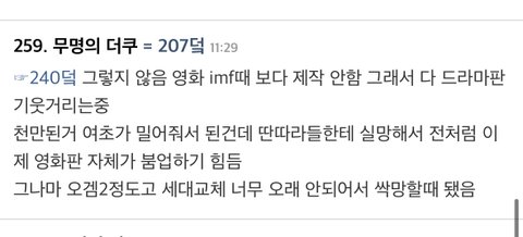 너무 공감가서 딴싸이트 댓글 가져옴 받고 영화 후반쪽에서 일하는데 전반적으로 다 드라마판 기웃거리고 (특히 넷플 디즈니) 근데 다 심각하게 말아먹는중. 배우들도 고인물인데 감독들이나 영화만드는 사람 기획하는 사람들도 고인물 너무 많음. 갠적으로 발전도 없고 아이디어나 참신한 발상 이런것도 없는거같음. 기존 영화만들던 감독들 넷플가서 영화만드면 뭐함 그냥 선정성만 더했지 똑같이 그지같던데 배우들도 좀 다양하게 뽑던가 뮤지컬판처럼 진짜 그사세될거같음.