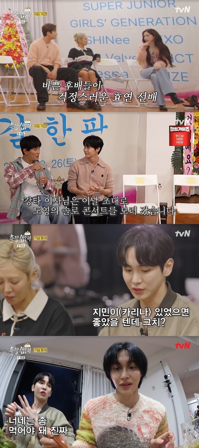 이때 효연은 카리나에게 "밥 먹었어?"라고 묻더니 못 먹었다는 말에 바로 녹화하러 가지 않냐며 걱정을 드러냈다. 효연은 다른 에스파 멤버들도 잊지 않고 챙겼다. 이런 후배 걱정에 수호도 동참했다. 수호가 "밥은 잘 먹니?"라고 다정하게 묻자 카리나는 "활동기일 때는 잘 안 먹으려고 한다. 일할 때 먹는 걸 별로 안 좋아해서"라고 답했고 효연은 "활동할 때는 잘 안 먹게 돼. 더부룩하고, 그치"라며 동감해줬다.