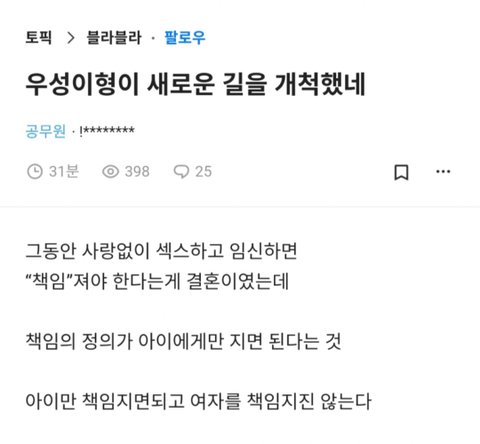 현실은 저 도태한남들 정우성 만큼의 양육비 줄 돈도 없음. ㅋㅋ 일부다처제에 감정이입해서 신나하는 것과 같은것임. 실제 일부다처제해도 저런 도태남들한테까지 기회가 안오는 것처럼.
