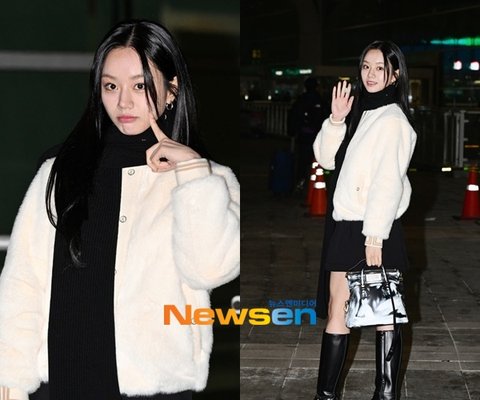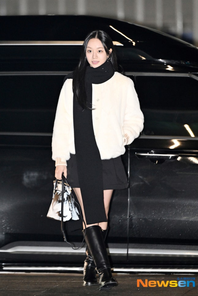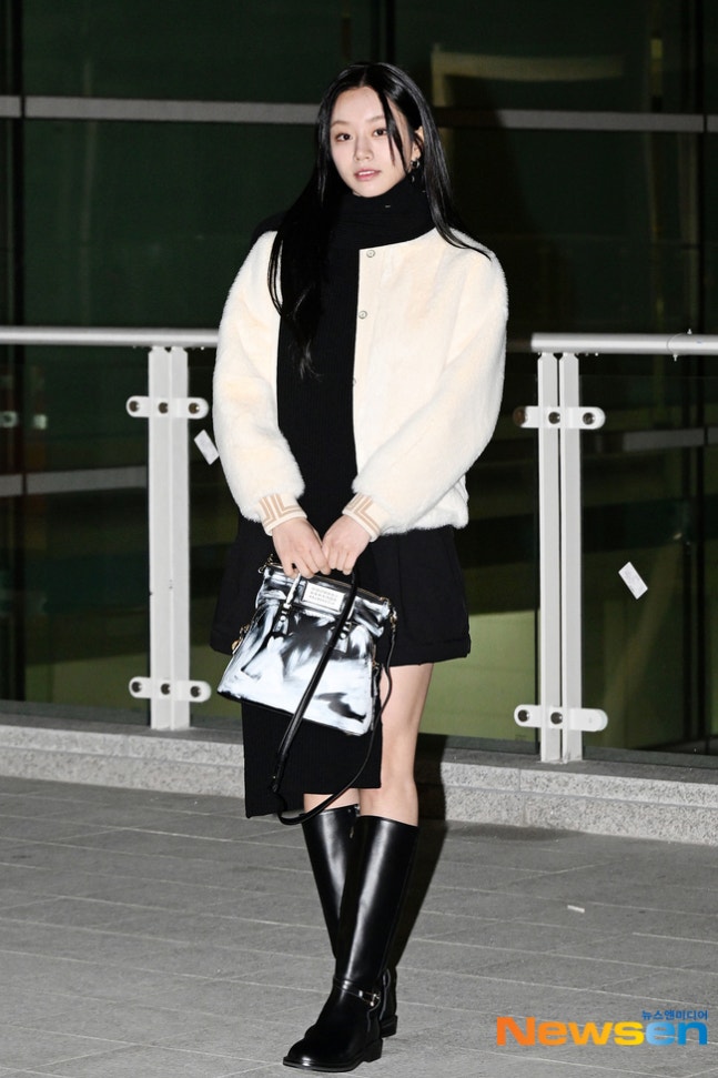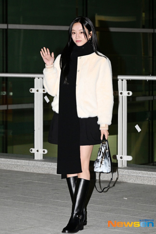 혜리이날 혜리는 화이트 퍼 재킷에 블랙 미니 스커트, 블랙 롱부츠, 블랙 머플러를 매치한 감각적인 공한 패션으로 시선을 사로잡았다.
