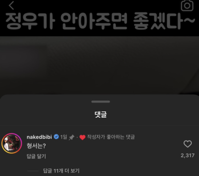 해당 장면이 담긴 게시글에 갑작스레 비비가 등장, "형서는?"이라며 댓글을 달아 눈길을 끌었다.