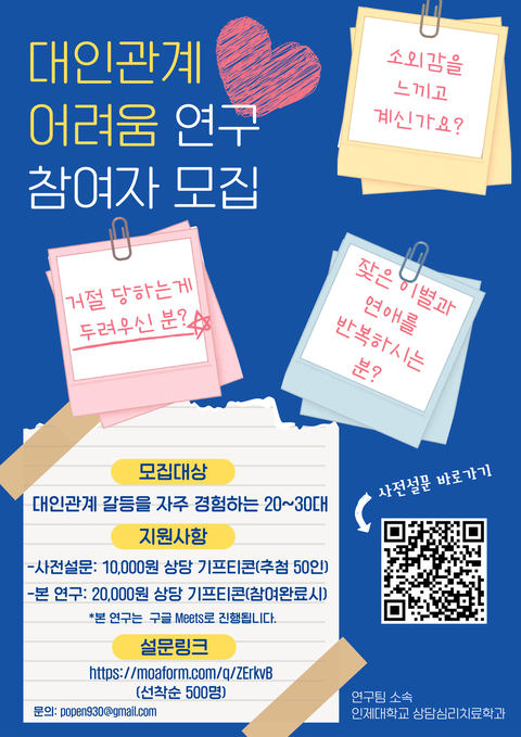 현재 참여자의 대인관계 성향을 알아보는 사전 설문지 참여자를 모집하고 있으며, 추후 설문지 참여자분들중 15~20%를 선발하여 본 연구까지 진행을 하고자 합니다.