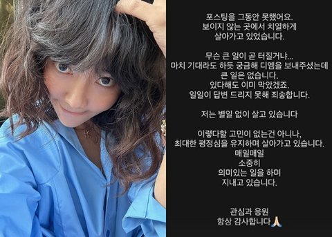 이어 "일일이 답변드리지 못해 죄송하다. 저는 별일 없이 살고 있다. 이렇다 할 고민이 없는 건 아니나, 최대한 평정심을 유지하며 살아가고 있다. 매일매일 소중히 의미 있는 일을 하며 지내고 있다. 관심과 응원 항상 감사하다"라고 전했다.