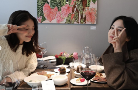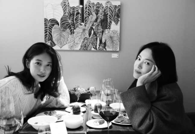 이와 함께 공개한 사진들 속에는 우아한 분위기의 단발머리 송혜교와 니트를 입고 따뜻하고 자연스러운 매력을 뽐내고 있는 수지가 한 레스토랑에서 식사를 하며 포즈를 취한 모습이 담겨 있다. 함께 와인 한 잔도 기울인 모습이다.