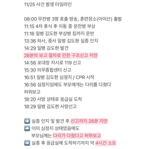 ✅ 일병 김도현을 발견하고 26분을 군대 소대장, 중사등과 통화하며 버렸고, 산이 험해 지상구조가 되지 않는걸 알면서도 의무군대종합센터의 신고는 1시간 뒤에 하였습니다.