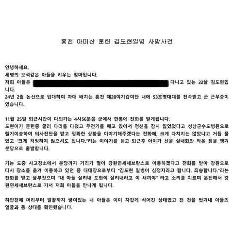 ✅ 가는 도중 사고장소에서 성남까지 거리가 멀어 강원 연세세브란스로 이동하겠다는 전화를 받아 강원으로 다시 장소를 옮겨 이동하고 있던 중, 대대장으로부터 “김도현 일병이 심정지라고 합니다. 죄송합니다."라는 전화를 받고, 병원에 도착하니 아들은 이미 사망한 상태였습니다.