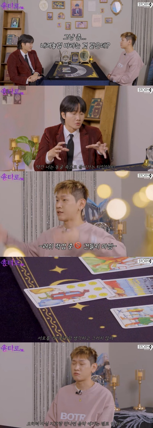 이 자리에서 크러쉬가 지코를 떠올리며 "저를 어떻게 생각하는지 궁금하다"라고 물었다. 타로를 본 이용진이 "그냥 좀 내려놓길 바라는 것 같은데?"라고 입을 열었다. 크러쉬가 고개를 끄덕였다. "얼마 전에 만났을 때 딱 그런 얘기를 했다. '너도 좀 숨을 쉬고 살아라, 음악에만 쏟아붓는 게 걱정된다' 하더라"라고 털어놨다.