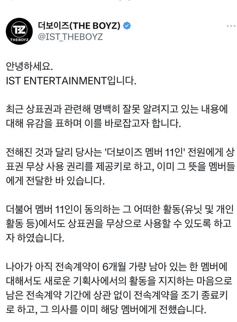 아이스티가 더보이즈 “멤버들”한테 “더보이즈”라는 팀 이름 사용할 수 있게 넘겼는데 원헌드레드가 “더보이즈” 이름 상표권 우리거임 우리한테 넘겨 ㅇㅈㄹ해서 아이스티가 그럼 수십억 줘 이랬다가 원헌드레드 빡쳐서 언플 때리고 더보이즈 다른 이름으로 활동한다고 언플 때림 결국 빡친 아이스티가 입장문 내서 우린 멤버들한테 상표권 줄거고 회사에게는 줄 생각 없음 이럼