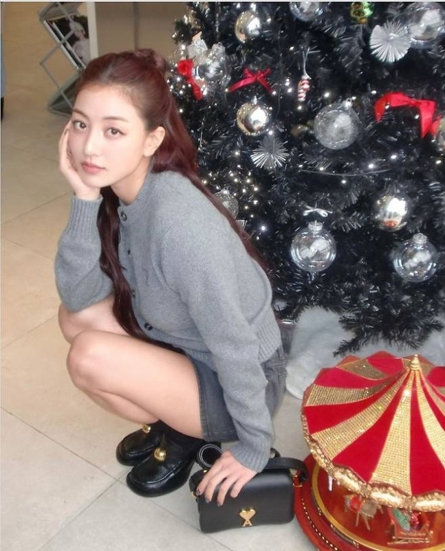 10kg 감량한 지효가 크리스마스 트리 앞에서 극미니 룩을 완벽하게 소화했다. 사진=SNS