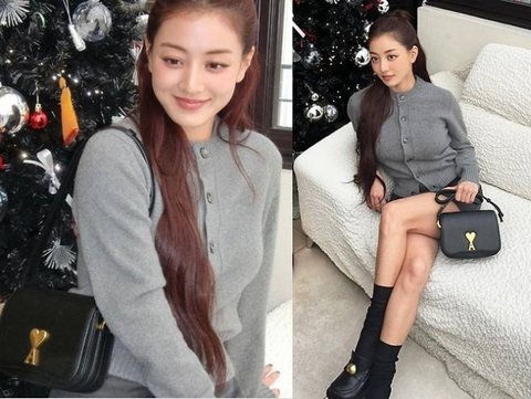 지효는 심플하면서도 세련미를 더한 스타일링으로 감각적인 룩을 선보였다. 그레이 컬러의 클래식한 카디건과 데님 미니스커트는 편안하면서도 트렌디한 조합을 완성했으며, 블랙 롱삭스와 로퍼로 캐주얼한 매력을 극대화했다. 특히 골드 하트 장식이 돋보이는 블랙 미니백은 포인트 아이템으로 눈길을 사로잡았다.