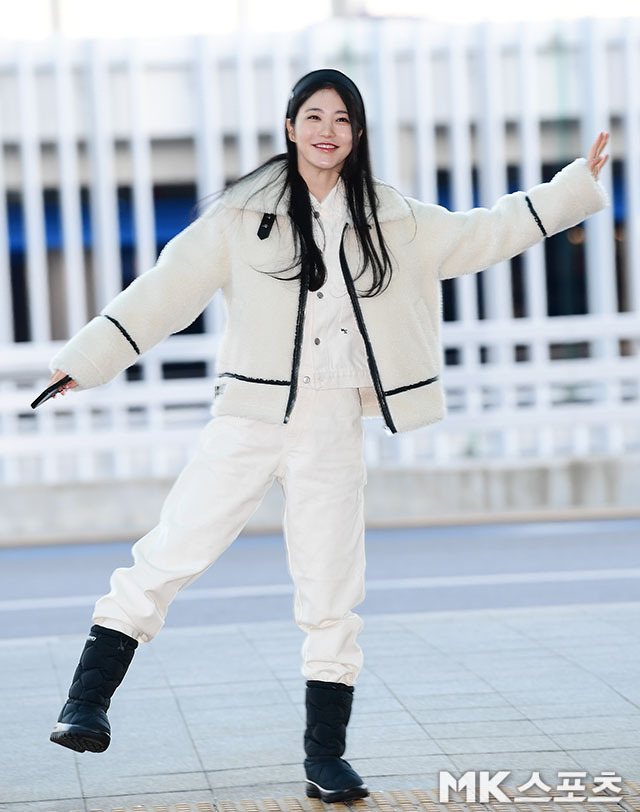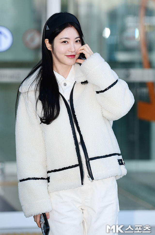 화이트와 블랙의 조화가 돋보이는 플리스 무스탕은 신예은 특유의 따뜻하고 부드러운 이미지를 극대화했다. 여기에 프라다 머리띠로 귀여운 포인트를 더하며 남다른 패션 감각을 과시했다. 특히, 양털 소재가 주는 포근함은 겨울철 필수 공항패션의 정석을 보여주는 듯했다.