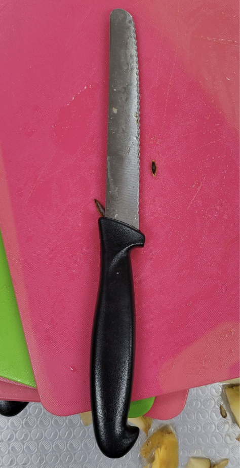 병원에 도착 후 응급진료를 받는데 칼 사진이 옴기사에는 빵칼이라고 나와있는데 아래 사진인 톱날 과도였음.이 과도를 1:8 수업으로 8명의 아이들이 동시에 들고 있었음.