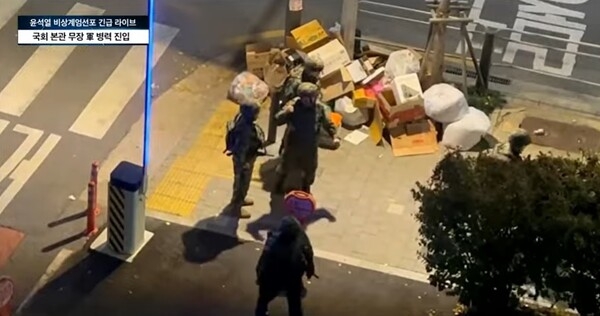 ‘김어준의 뉴스공장’(겸손은 힘들다) 방송 근처에 주둔한 계엄군. 사진 | 유튜브대신 진보 진영에서 인기를 얻고 있는 유튜브 ‘김어준의 뉴스공장’엔 계엄군이 배치돼 실제로 출입을 통제하며 공포를 조성했다. 이재석 전 KBS 기자는 4일 새벽 진행한 방송에서 “10여 명이 서울 충정로에 있는 방송국 스튜디오 출입문을 봉쇄했다”며 군인들이 사옥 앞에 무리 지어져 있는 사진이 공개했다. 양지열 변호사 등 진행자들도 들어가지 못했고, 진행자인 김어준은 군인들을 피해 모처로 도피했다고 전했다.