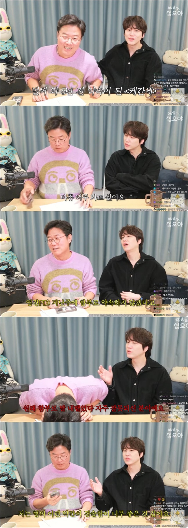 5년 만에 '케간세'를 다시 언급한 나영석PD는 "콘서트 언제 끝난다고? 5월부터는 시간 되니?"라고 일정을 조율했고 규현은 "너무 가고 싶다. 지원이 형도 (얘기했다.) 지원이형 수근이형이랑은 계속 본다"고 밝혔다.이에 나영석PD는 "스케줄 언제 되는지 물어보게"라며 이수근의 스케줄을 물어보려다 "영경이가 찍어야 되는데 죄송하다. 영경이가 억지로 웃고 있는 거 같다"고 이영경PD의 눈치를 봤다.