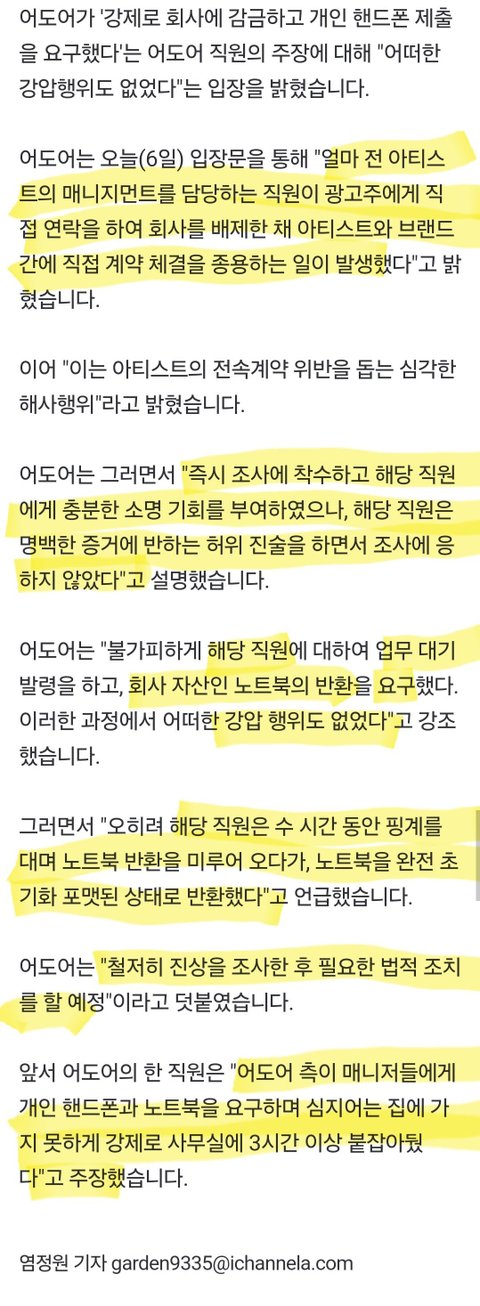 현재 어도어와의 남은 스케줄을 성실히 임하고 있다고 밝힌 이들은 "해당 스케줄을 도와주시는 매니저님들과 퍼디님들께서 어도어와 하이브로부터 노트북을 빼앗기고 예고없이 들이닥쳐 조사를 받는 등 심각한 괴롭힘을 당해 울고 계시는 모습도 목격했다. 남은 스케줄을 진행하는 스태프분들에 대한 이런 행동이 저희는 너무 납득하기 어렵다"라고 폭로했다.