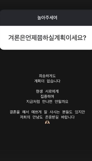 이에 이소라는 "죄송하게도 계획이 없다. 현생 서로에게 집중하며 지금처럼 만나면 안 될까요. 결혼을 해서 예쁘게 잘 사시는 분들도 있지만 저희의 만남도 존중받길 바랍니다"라는 단호한 입장을 밝혔다.