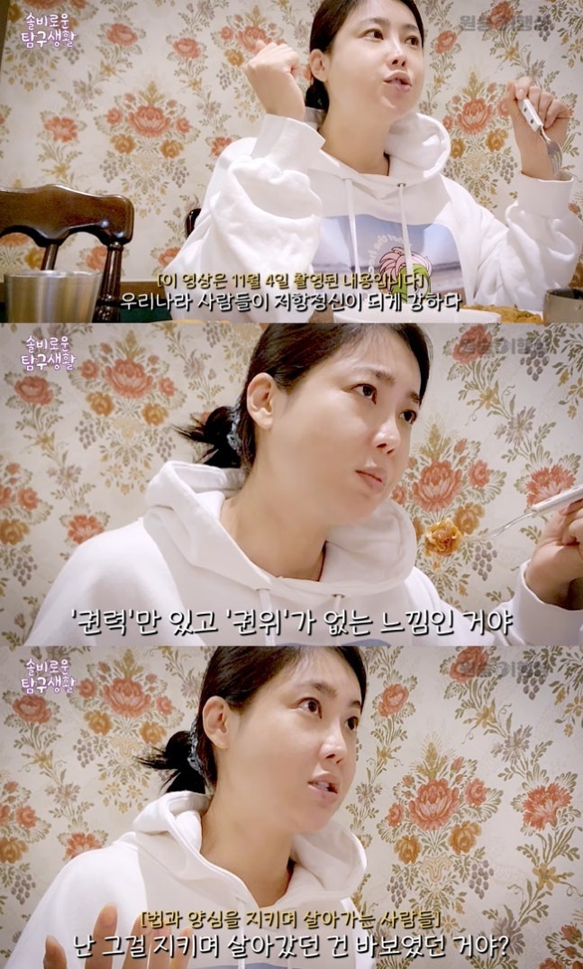 사진=‘시방솔비’ 채널 영상 캡처솔비는 “권위와 권력은 되게 다르다고 생각한다. 지금은 권력만 있고 권위가 없는 느낌이다”라고 소신을 밝힌 뒤 “돈을 많이 벌기 위해서는 불법을 저지를 수 있는 유혹들이 있다. 그런데 사람들은 그거를 법이라는 테두리, 양심으로 참고 살아간다. 근데 권력이 있는 사람들이 그걸 어겼는데 그걸로 처벌도 안 되면 ‘뭐야. 그럼 그걸 지키며 살아갔던 나는 바보였던 거야?’라는 생각을 하게 되는 거다. 권력을 가지고 개인적인 어떤 이득을 위해서 쓰는 건 굉장히 문제가 있는 거지”라고 말했다.