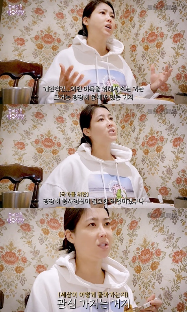 솔비는 “국회의원 이런다고 해서 나랏돈 먹으니까 막 공짜로, 일 안 하는 것처럼 보이는데 그게 아니라 굉장히 봉사 정신이 필요한 직업이겠구나. 이 생각을 첫 번째 했고. 실제로 매일매일 공부가 필요한 직업이구나, 그런 생각했다”라면서도 “권위는 스스로 가치를 만들어 가는 거지만 권력이라는 걸 끝없이 견제해야 된다. 그러면은 국민이 할 수 있는 견제란 뭘까. 관심을 가지는 거다”라고 강조했다.