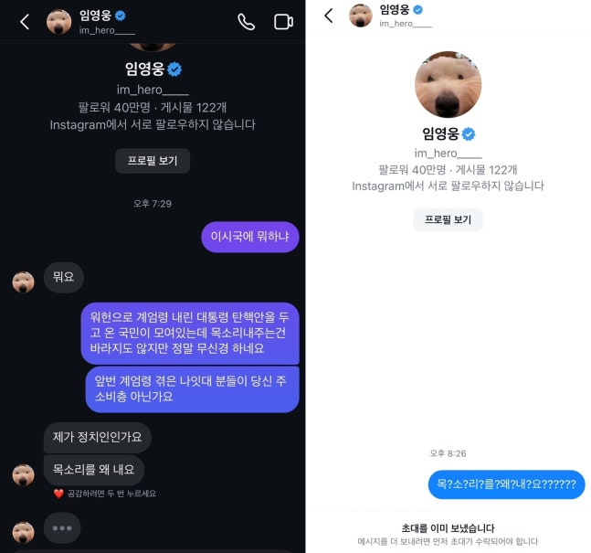 이를 본 또 다른 누리꾼은 임영웅의 발언이 황당하다는 듯 "목소리를 왜 내요?"라고 메시지를 보냈다가 그에게 차단당했다고 주장했다.