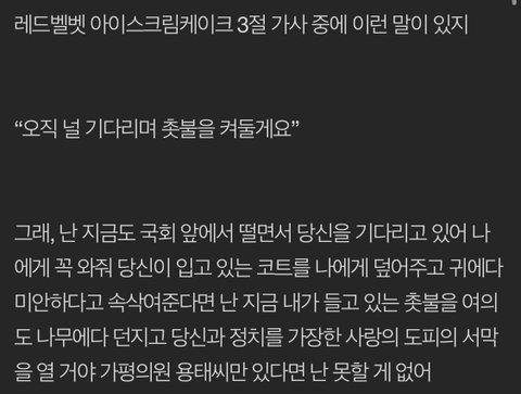 그래, 난 지금도 국회 앞에서 떨면서 당신을 기다리고 있어 나에게 꼭 와줘 당신이 입고 있는 코트를 나에게 덮어주고 귀에다 미안하다고 속삭여준다면 난 지금 내가 들고 있는 촛불을 여의도 나무에다 던지고 당신과 정치를 가장한 사랑의 도피의 서막을 열 거야 가평의원 용태씨만 있다면 난 못할 게 없어
