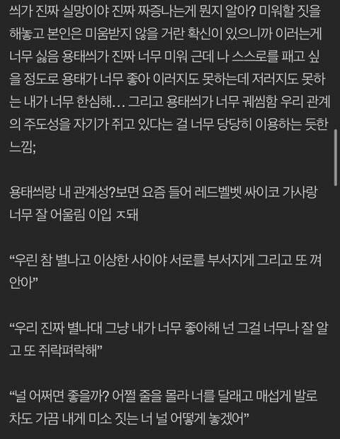 니가 어떻게 날 이렇게 실망시킬 수 있어? 너랑 헤어져야 하나 이런 생각을 하게 하는게 남친으로서 맞는 행동이야? 결국 난 원래부터 너랑 연인 사이도 아니고 넌 나를 모르기 때문에 연인이 아니라서 아무것도 할 수 없다는 좌절감을 나에게 안겨주었지 이게 너가 저지른 가장 큰 잘못이야 나 진짜 용태씌만 생각하면 눈물나려 그래