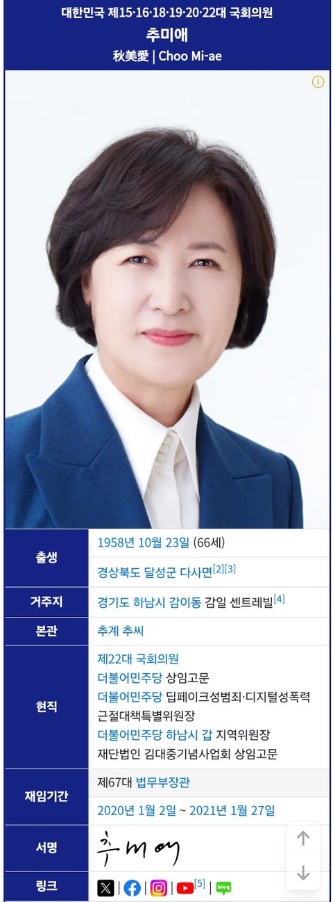(사진1 설명) 추미애(秋美愛, Choo Mi-ae 대한민국 제15·16·18·19·20·22대 국회의원 <출처 : 네이버 나무위키>