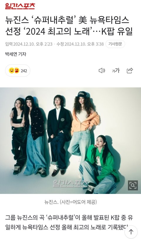 그룹 뉴진스의 곡 ‘슈퍼내추럴’이 올해 발표된 K팝 중 유일하게 뉴욕타임스 선정 올해 최고의 노래로 기록됐다.