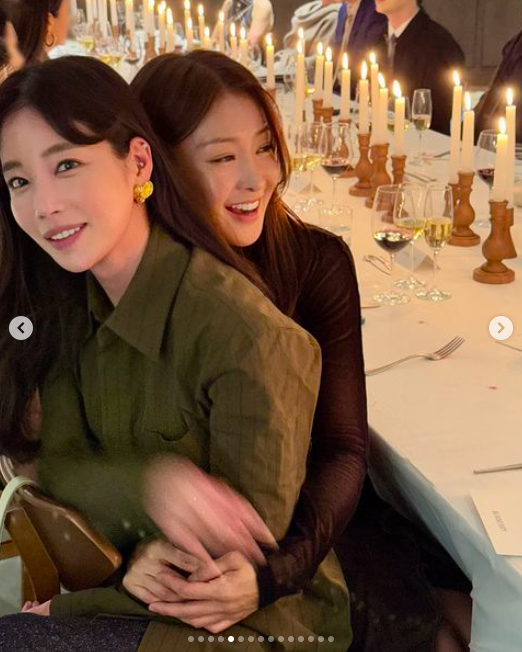 사진 속 이시영은 명품 브랜드 B사 행사에 참석, 배우 기은세와 만나 즐거운 시간을 보낸 모습이 담겼다. 두 사람은 똑같이 턱을 괸 채 포즈를 취하거나 꽉 끌어 안는 등 친분을 과시했다.