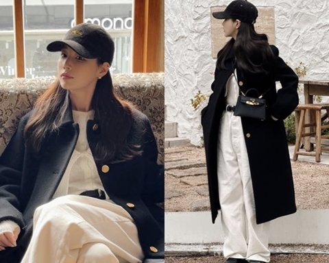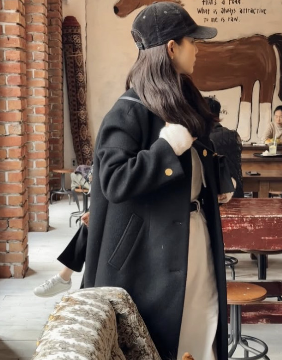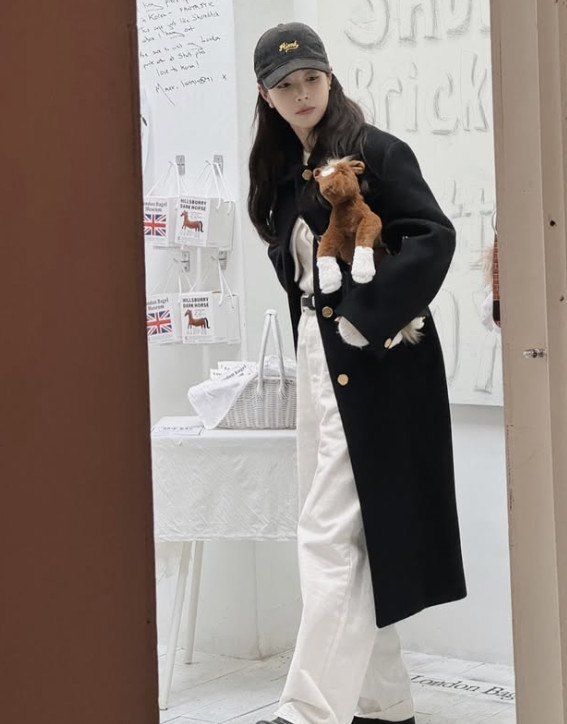 기은세 소셜 계정 캡처사진 속 기은세는 블랙 컬러의 롱 코트를 입고 다양한 포즈를 취하고 있다. 기은세는 여기에 루즈핏 화이트 팬츠를 매치해 밝은 분위기를 더했다.