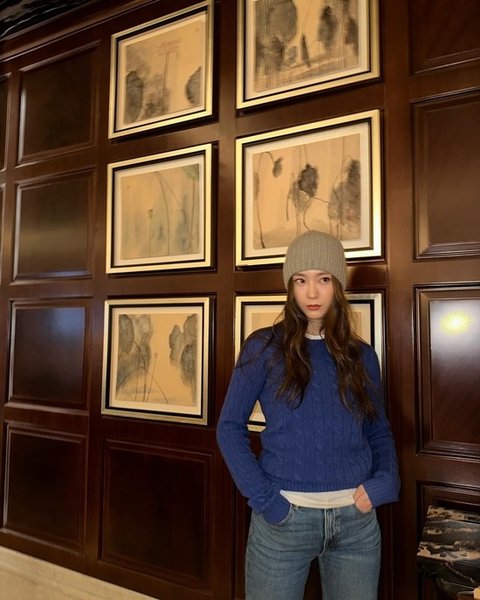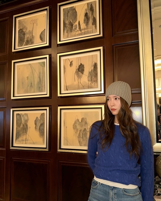 이번에 함께 공개된 사진에는 쨍한 블루 니트에 청바지를 매치, 비니를 쓰고 있는 정수정의 모습이 담겨있다.