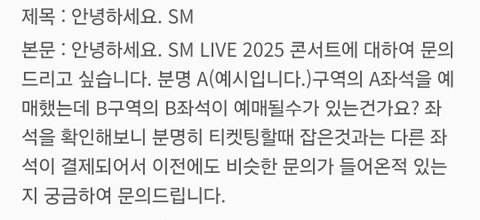 사건 정리: 이 일은 본인과 본인의 친구(A씨)가 함께 SM 30주년 콘서트 티켓팅을 하면서 발생했다. 일단 본인은 ‘NCT’와 ‘RIIZE’를 좋아하는 시즈니이자 브리즈이고 A씨는 티켓팅 경험이 많은 유애나이다. 본인은 이번 티켓팅으로 멜론 티켓을 처음 사용해 보았고 A씨는 본인 본진 티켓팅으로 멜론 티켓을 자주 사용해 보았다. 웬만하면 늘 플로어석을 가던 티켓팅 능력자였기에 A씨에게 티켓팅을 부탁했었다. 티켓팅은 나름 순조롭게 해결이 되었다. 본인은 아직 대기 중이었지만 A씨가 먼저 들어가서 2층 중앙을 잡았다고 연락을 보냈다. 근데 결제하려고 보니 가격이 이상하여 A씨와 통화를 하며 확인을 해보니 A씨가 잡았다고 얘기해 준 자리는 T04 구역 B 열이었다. 근데 예매 확인을 해보니 예매 좌석이 413 구역 T 열이었다. 아주 많이 당황스러웠고 A씨와 함께 멜론 티켓에 글로 문의도 보내보고 전화로도 문의를 했는데 돌아오는 대답은 둘 다 똑같았다. 좌석을 선택하고 결제창으로 넘어가서도 본인이 선택한 자리가 어딘지 계속 보인다고 멜론 티켓 쪽에서는 주장하였다. 또한 우리가 화면 녹화나 다른 증거가 없기 때문에 본인들은 해줄 수 있는게 없다는 주장이다.