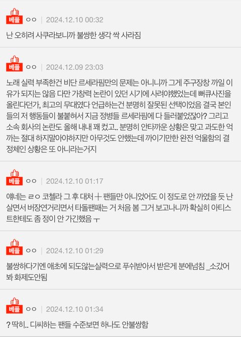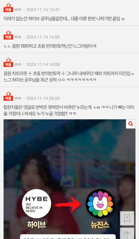 아니 진짜 궁금해서 그러는데 뉴진스만 왤케 오구오구 해주는거임? 르세라핌 베댓들보면 글쓴 내용과 관련없는 거의다 안좋은 글이길래 그럼 그냥 추천, 반대수만 봐도 좋은 글이라도 르세라핌 이면 반대 꽂히고 뉴진스면 추천이 대부분이길래 뉴 릇 팬들이보면 아닐수도 있는데 타팬이보면 사람들이 너무 르세라핌한테만 악감정있는거같음