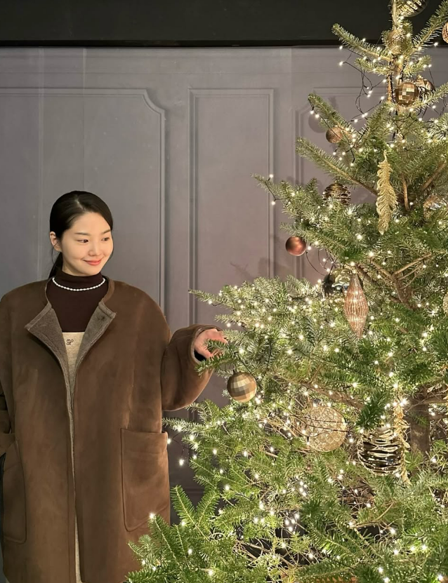 사진 속 류이서는 크리스마스 트리 옆에서 어딘가를 바라보며 포즈를 취하고 있다. 류이서는 뷔스티에 원피스와 목폴라를 매치하고 오버핏 재킷을 입으며 청순하면서도 따뜻한 룩을 완성했다.