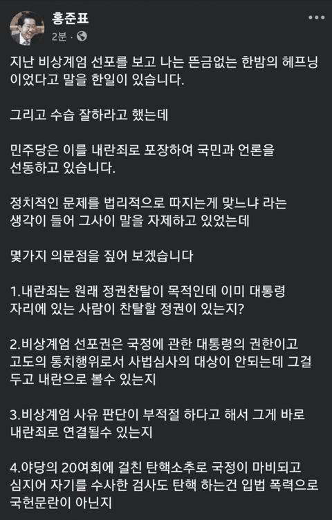 홍준표 치매인간이라 생각했는데 지금은 제정신인가 보내 내가 생각하는 내란죄랑 똑 같네 대통령이 반역?역모?내란?기도 안차고 멍청한 개돼지들 선동하고 선동당하는 머가리들은 뭔지 싶다 내란죄는 애초에 추악한더불어성범죄당 아닌가?국정이 마비될 정도로 온갖 억지로 탄핵 외치는 전과자집단들~세계 언론 지들 입장에 맞는 것만 끌어와서 국내언론 전부 좌파들 앞잡이 인것 모르는 사람 있나 내란죄가 뭔지 제대로 알고 시부리는지 성범죄집단 것들과 검사판사 전부 거의 법대나온 인간들 아닌가?어찌 법도 모르는 것들이 입법을 하는지 기도 안찬다 귀에 걸면 귀걸이 코에걸면 코걸이씩 법 해석~국민과 나라위해?누가 찢죄명이?더불어성범죄당이?한똥훈이?다들 지들 배떼지 채울려는 욕심만 가득차선 한똥훈 너도 웃기고 자빠졌다 대통령 권한대행은 국무총리인데 니가 뭔데 국무총리랑 국정을 운영해?미친 이런 것들이 정치를 하니 나라꼴이 국민꼴이 말이 아니다 정말 하늘이 있다면 벼락이라도 쳐서 말도 안되게 시위하는 것들과 앞잽이들 쓸어버렸으면 좋겠네