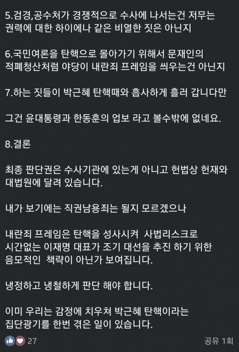 내란죄 프레임이 아니라 걍 내란죄야. 온국민이 밤새 못자고 국회에 군대가 쳐들어오고 포고령으로 처단을 하겠다느니 하는꼴을 생중계로 다 지켜봤는데 말장난좀치면 내란이 내란아닌게 되니?