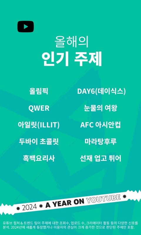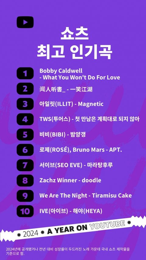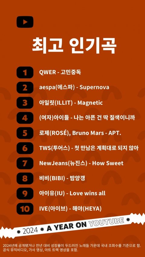 유튜브 코리아 연말 결산 - QWER, 에스파, 아일릿, 아이들, 로제/브루노, 투어스, 뉴진스, 비비, 아이유, 아이브