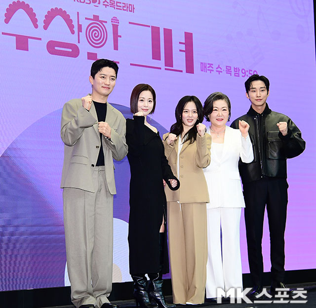 12일 오후 상암 스탠포드호텔에서 KBS2 수목드라마 ‘수상한 그녀’의 제작발표회가 진행됐다. 이날 제작발표회에는 박용순 감독을 비롯해, 김해숙, 정지소, 진영, 서영희, 인교진 등이 참석했다. / 사진 = 김영구 기자김해숙은 나보다 가족이 먼저였던 삶 속에서 꿈 같은 젊음의 시간을 얻게 된 할머니 오말숙 역을 연기하며, 겉은 20대지만 속은 능청 맡은 할머니인 걸그룹 연습생 오두리를 연기한다. 진영은 작곡, 프로듀싱, 기획력 모든 걸 갖춘 유니스 엔터의 책임 프로듀서 대니얼 한을 연기한다.젊어진 ‘K-할머니’가 된 김해숙은 정지소가 자신의 젊은 시절을 연기하는 것에 대해 “정지소가 너무 예뻐서 기분이 좋았다. 대리만족을 했던 것 같다”먀 “같은 오말순을 연기하게 되면서 정지소와 많은 이야기를 했다. 처음 대본리딩 때 대사를 하는데 정지소에게서 굵은 목소리가 나오더라. 됐다 싶었다. 서로 맞춰가려고 이야기도 많이 나눴다”고 털어놓았다.
