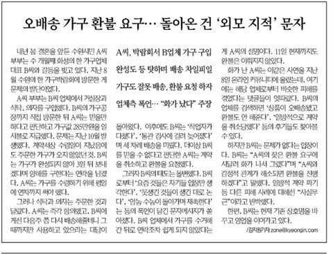 링크 : 오배송 가구 환불 요구… 돌아온 건 ‘외모 지적’ 문자