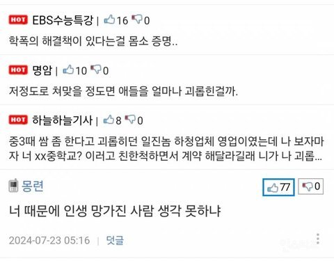 저렇게 쳐 맞았는데 또 쳐 맞았다는건 저 정도로 쳐 맞아도 정신 못차리고 또 그 양아치 짓을 했다는건데 그 당시 당신한테 당한 괴롭힘으로 평생 트라우마에 버티며 사는 사람들은 어떨까?