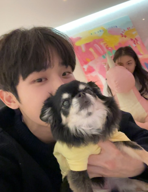 사진 속 최시훈은 반려견을 끌어안고 카메라로 자신의 모습을 촬영하고 있다. 최시훈의 뒤에는 에일리가 장난기 가득한 표정으로 카메라를 바라보고 있다.