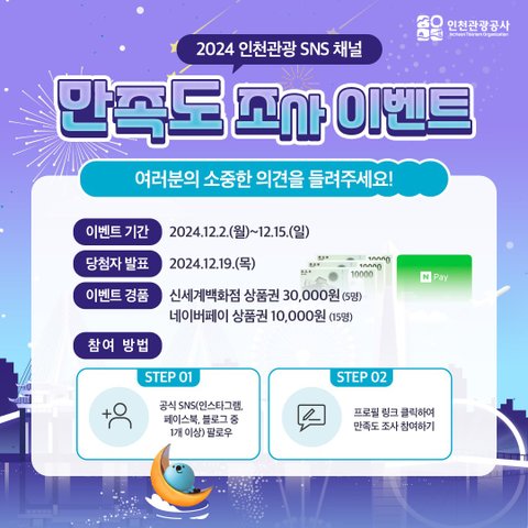 인천관광공사에서 인천관광공사 SNS 팔로우 후 만족도 조사 참여하면추첨을 통해 신세계 백화점 상품권과 네이버페이 상품권을 드리는 이벤트를 진행중에 있습니다.