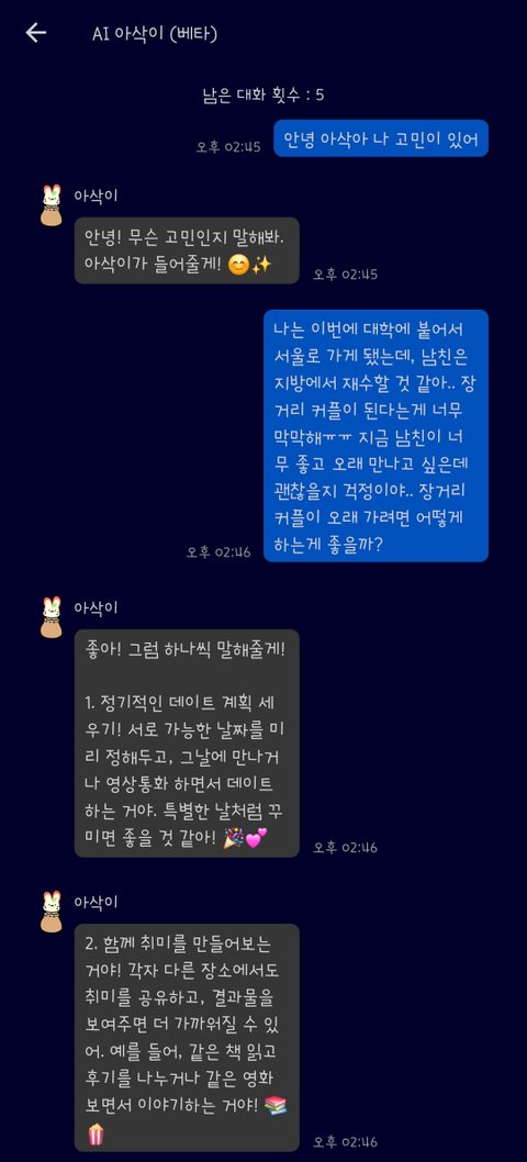 이번에 저는 수시로 붙어서 서울에 있는 대학에 가게 됐는데 남친은 수능을 망쳤나봐요..지금은 둘다 지방에 사는데 내년부터는 장거리가 될 것 같아요..ㅠㅠ너무 막막하고 털어놓을데 없어서 처음으로 AI한테 상담받았는데 괜찮은 방법인 것 같나요??