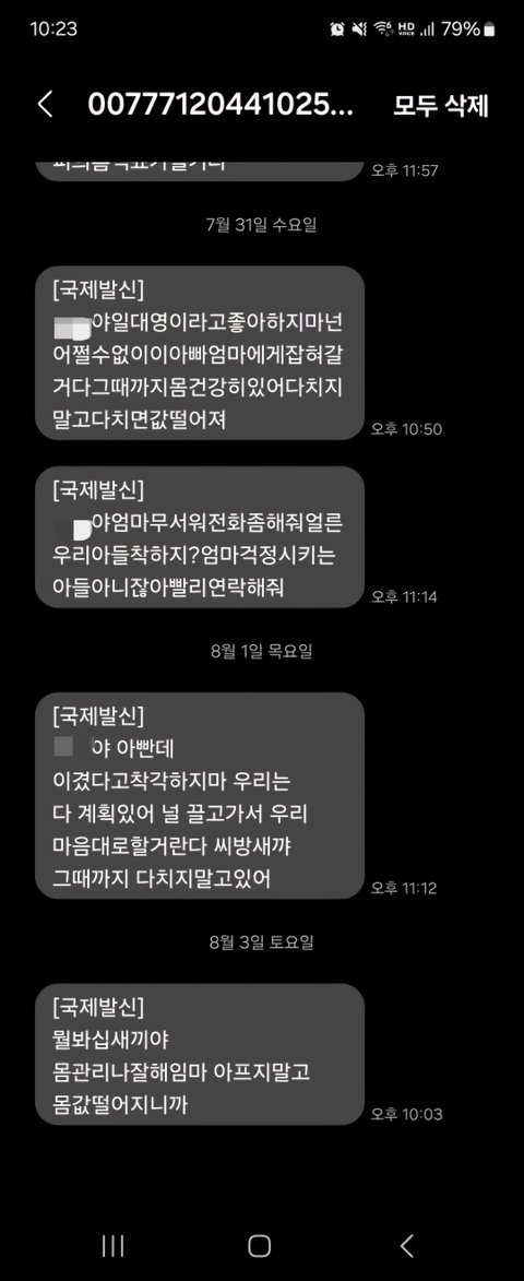 “오빠 정신병원 좀 안가겠다고 난리구나 아주?”, “우리가 잡으러가는 동안 명훈(가명) 건강 잘 챙겨줘요, 다치거나 아프면 장기 팔 때 몸값 떨어지니까요. 부탁할게” 이런 말도 안되는 허무맹랑한 국외 발신 문자들을 저희도 믿어도 된다는 소리입니까?
