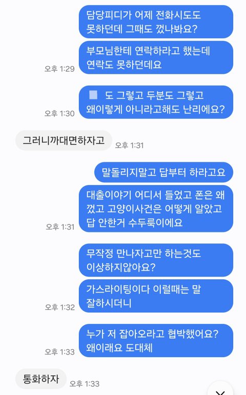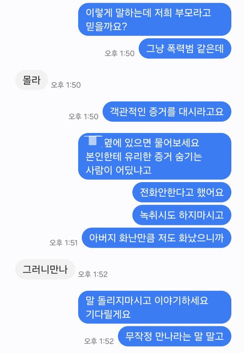 이에 부모님들은 해결 될 때 까지 제 연락이 와도 무시하고 본인들도 굳이 급한일이 아니면 연락을 안하겠다고 말씀하셨습니다. (통화 녹취 보유)