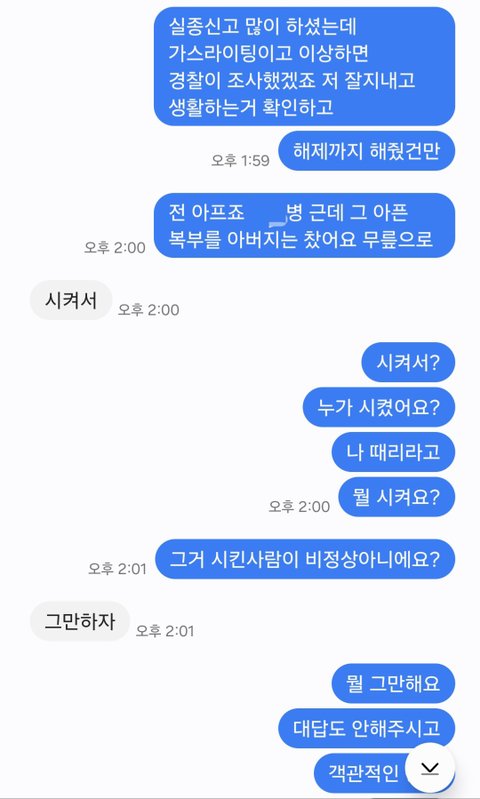 아버지는 경찰차에 타기전 저에게 때린 것에 대한 사과가 아니라 웃으면서 '명훈(가명)아 아프냐? 그러게 왜 도망가려고 했어.'라는 말을 하셨고 해당 상황에 있던 보안요원들과 미란(가명)은 그 말을 듣고 충격을 받았습니다. 폭행 이후 저는 상해진단서를 받았고 양쪽 팔에는 피멍까지 들었습니다.
