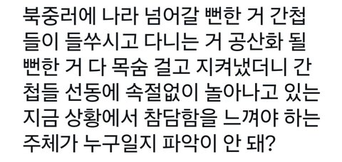 선동당한 게 누구인지도 모르고 본인들이 하는 언행들과 탄핵의 결과를 만드는 게 무조건 선이고 옳은 거라 생각하는 것 같음 다른 건 안 믿으면서 김어준 말 그대로 믿는 지능부터가 할 말 없긴 한데ㅋㅋ... 박근혜 때랑 달리 뭐가 맞고 잘못된 건지 보는 눈 길러진 사람들 늘어난 건 다행이지만 착잡함 김정은 올려치기 하고 북한 중국 감싸면서 미국이 주적이라고 말하는 애들 많은 것도 거짓말 같음